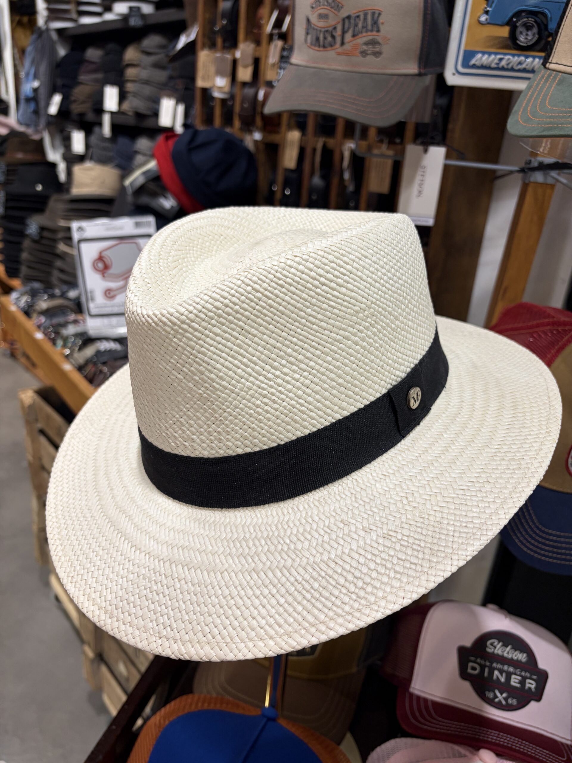 Son design iconique est sublimé par un ruban gros-grain noir, délicatement orné d’un pin’s métallique sur le côté, ajoutant une touche moderne et raffinée. Ce chapeau est parfait pour compléter une tenue chic ou décontractée, que ce soit pour une balade en ville, une journée à la plage ou un événement en plein air.